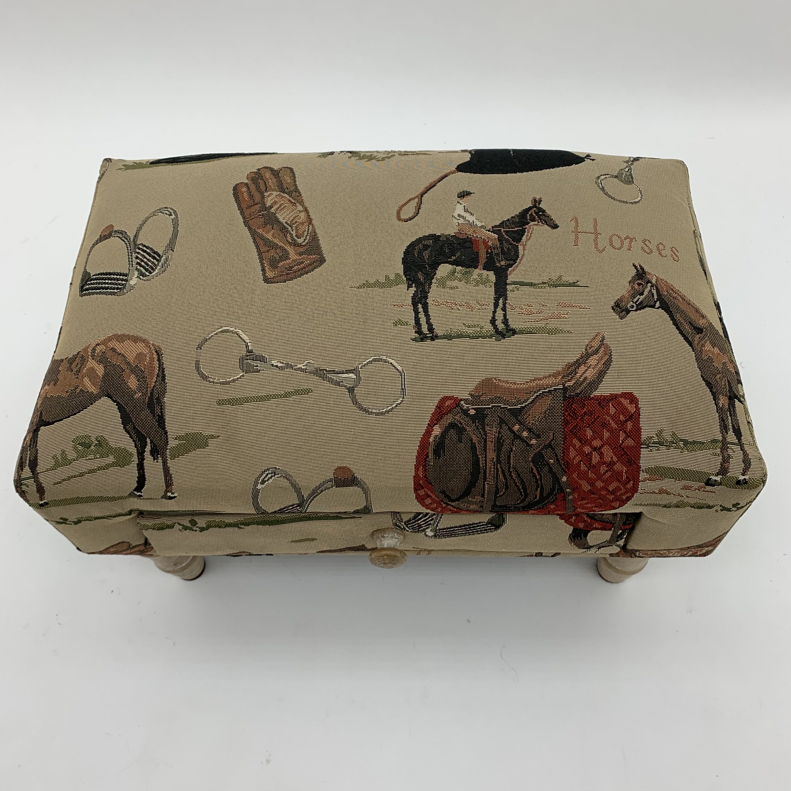 Immerse yourself in the enchanting world of equestrian decor with our EQUESTRIAN FABRIC FOOTSTOOL WITH DRAWER. This charming piece effortlessly combines style and practicality, making it a must-have for any UK home. Crafted from durable upholstery fabric in a warm beige hue, this footstool boasts a captivating equestrian-themed print in rich browns, reds, greens, and blacks, perfect for adding a touch of rustic charm to your living room or bedroom.