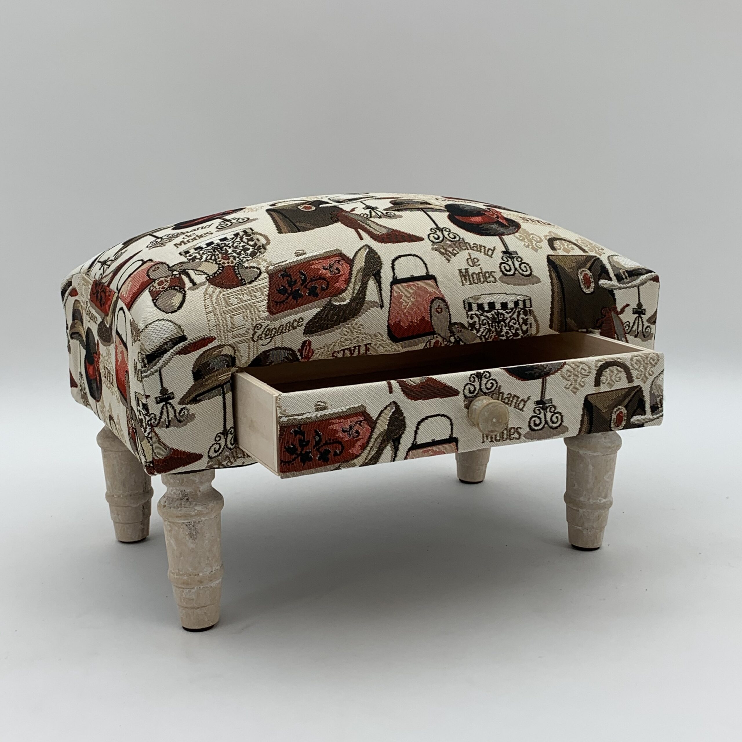 Add a touch of whimsy and elegance to your living space with our Ladies Fabric Footstool with Drawer. This stylish upholstered ottoman is the perfect blend of comfort and style, featuring a durable fabric cover with a unique print of fashion items like handbags and shoes.